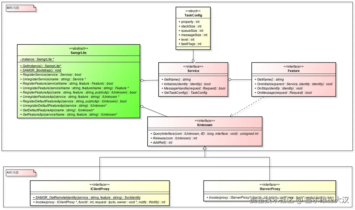 - A核:在M核能力基础之上,包含了进程间服务调用、进程间服务调用权限控制、进程间服务接口的开发等能力。