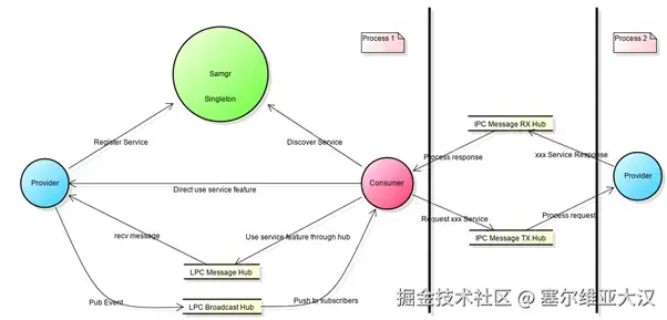 - Samgr:作为中介者,管理Provider提供的能力,同时帮助Consumer发现Provider的能力。