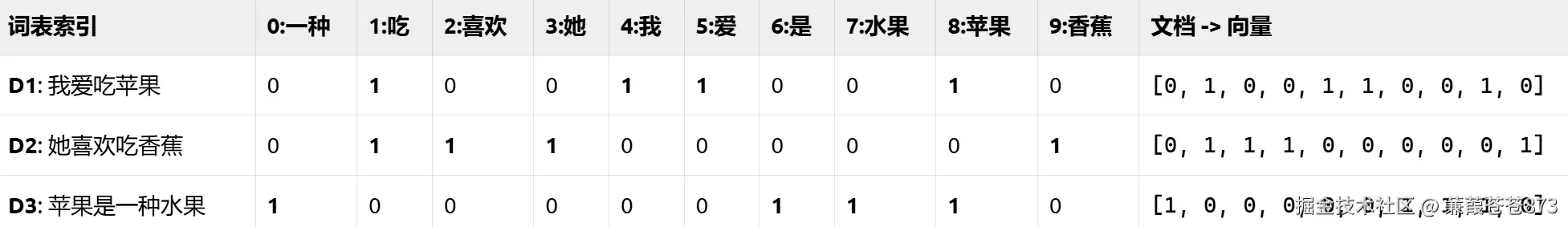 为每个文档创建一个长度为10的向量(对应词表),统计每个词出现的频率。