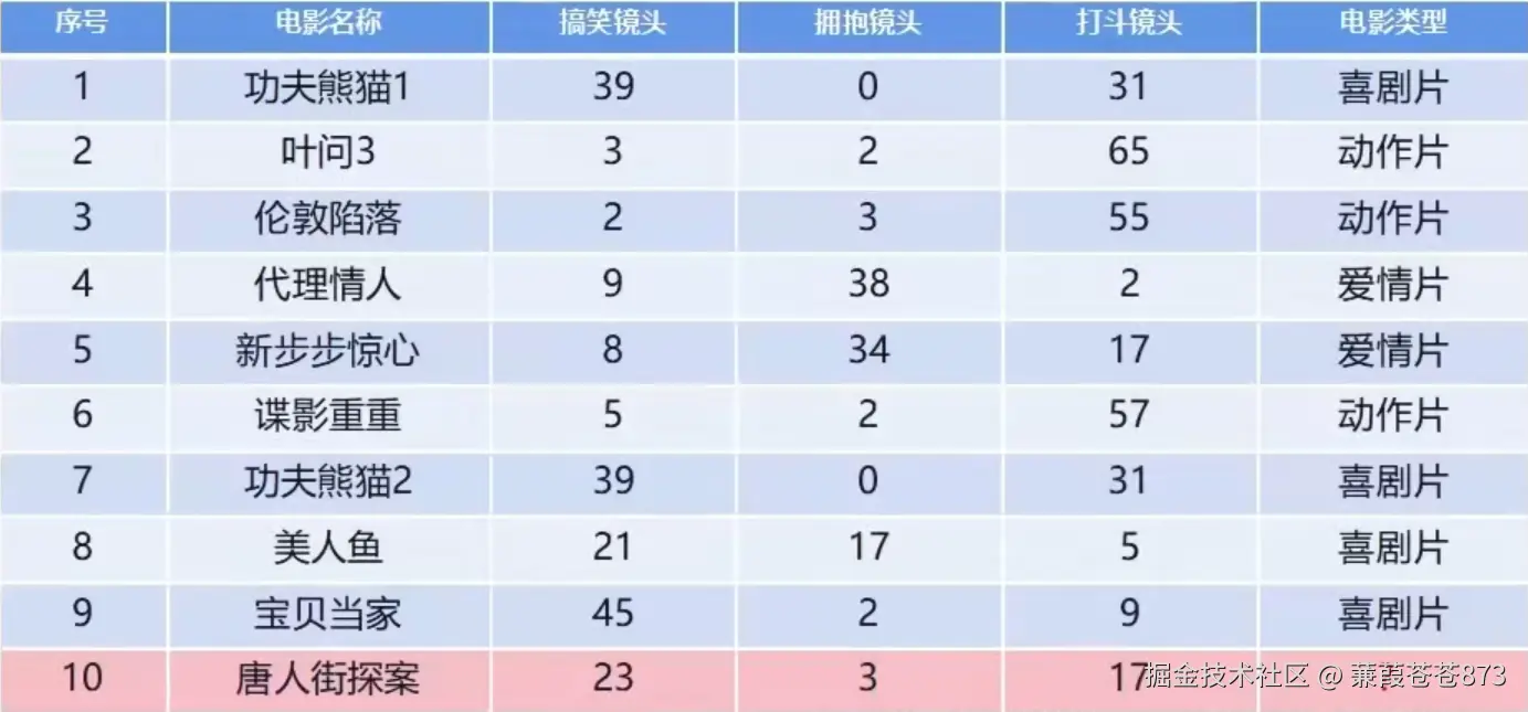 特征选择:选择 “搞笑镜头”“拥抱镜头”“打斗镜头” 的数量作为特征。