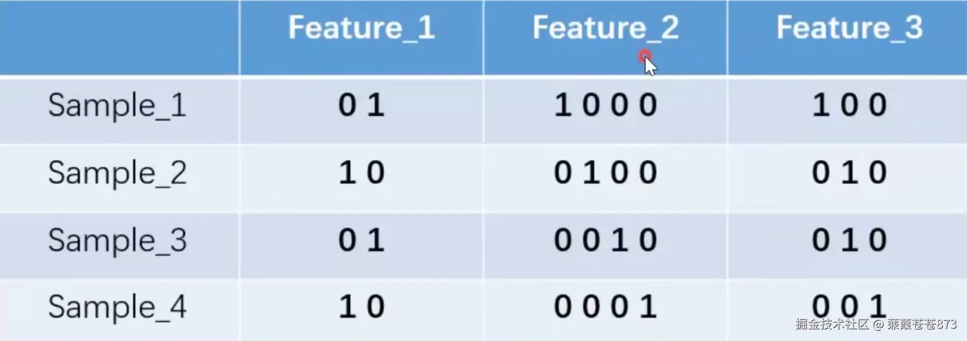 我们的 feature_1 有两种可能的取值,比如是男 / 女,这里男用 1 表示,女用 2 表示。