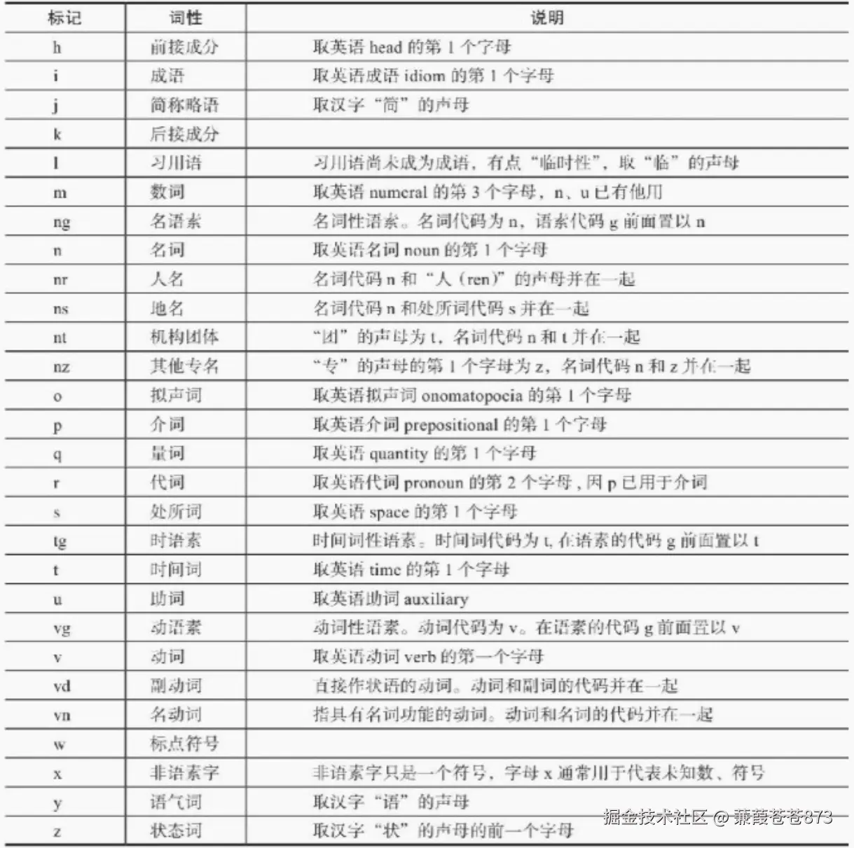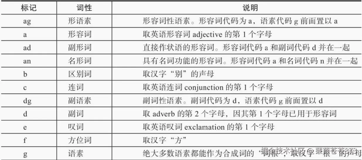 词性一般是指动词、名词、形容词等。例如:我/爱/v/北京/ns天安门/ns。其中,ns代表名词,v代表动词,ns、v都是标注,以此类推。