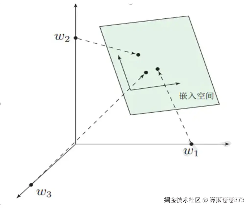 我们将 king 这个词从一个可能非常稀疏的向量空间,映射到现在这个四维向量所在的空间,这个过程称为 word embedding (词嵌入),即将高维词向量嵌入到一个低维空间