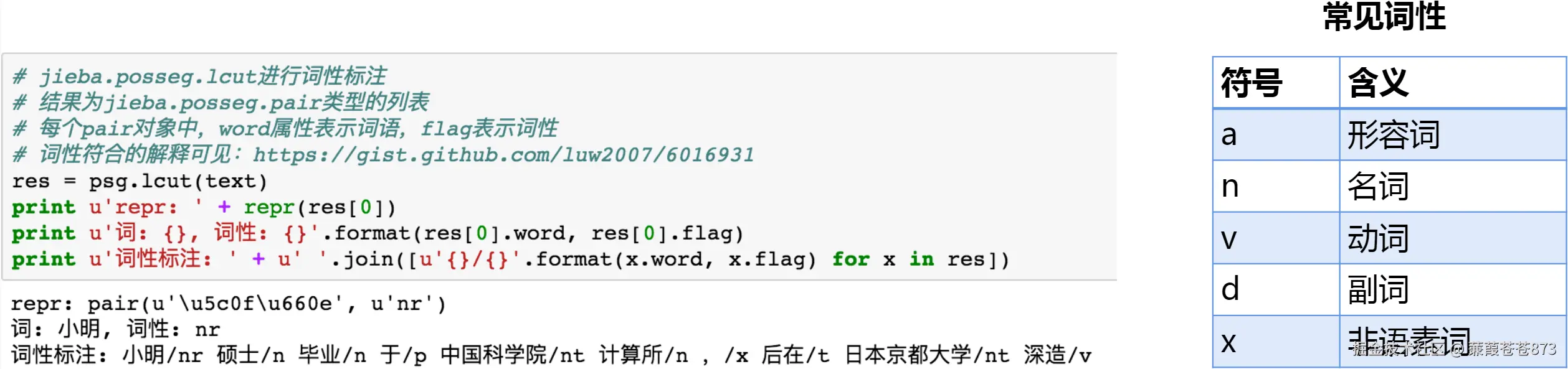 词性是词汇基本的语法属性,通常也称为词类。词性标注是在给定句子中判定每个词的语法范畴,
