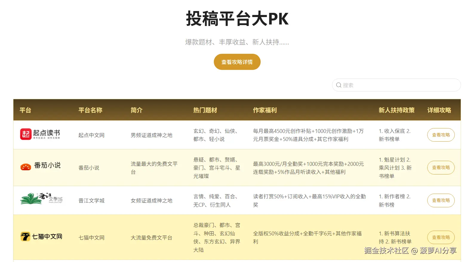 - 投稿指南+快捷投递:各大平台对比、热门题材、签约条件一目了然,笔灵小说一个网站都帮你整理好了,根本不需要自己再找攻略,帮你一站式搞定。