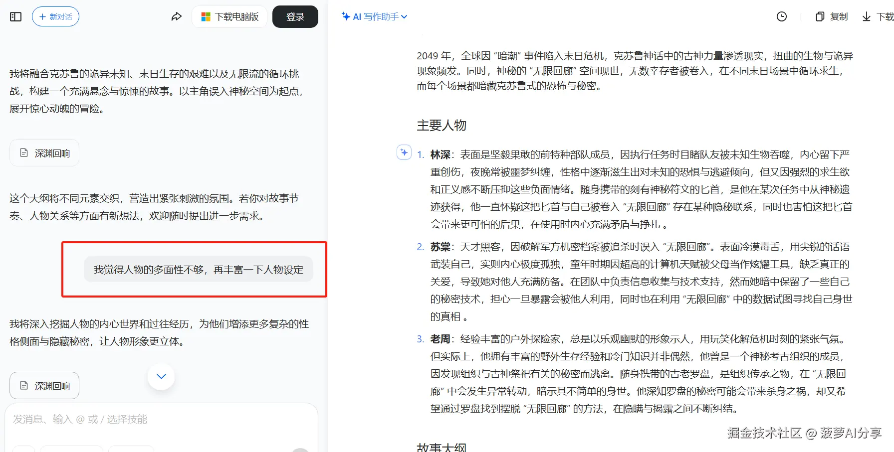 - 无限需求更改:可以针对第一次生成的不满意的部分提要求,接着输出,并且豆包会随着你提问的次数增多,对小说的设定会逐步完善。