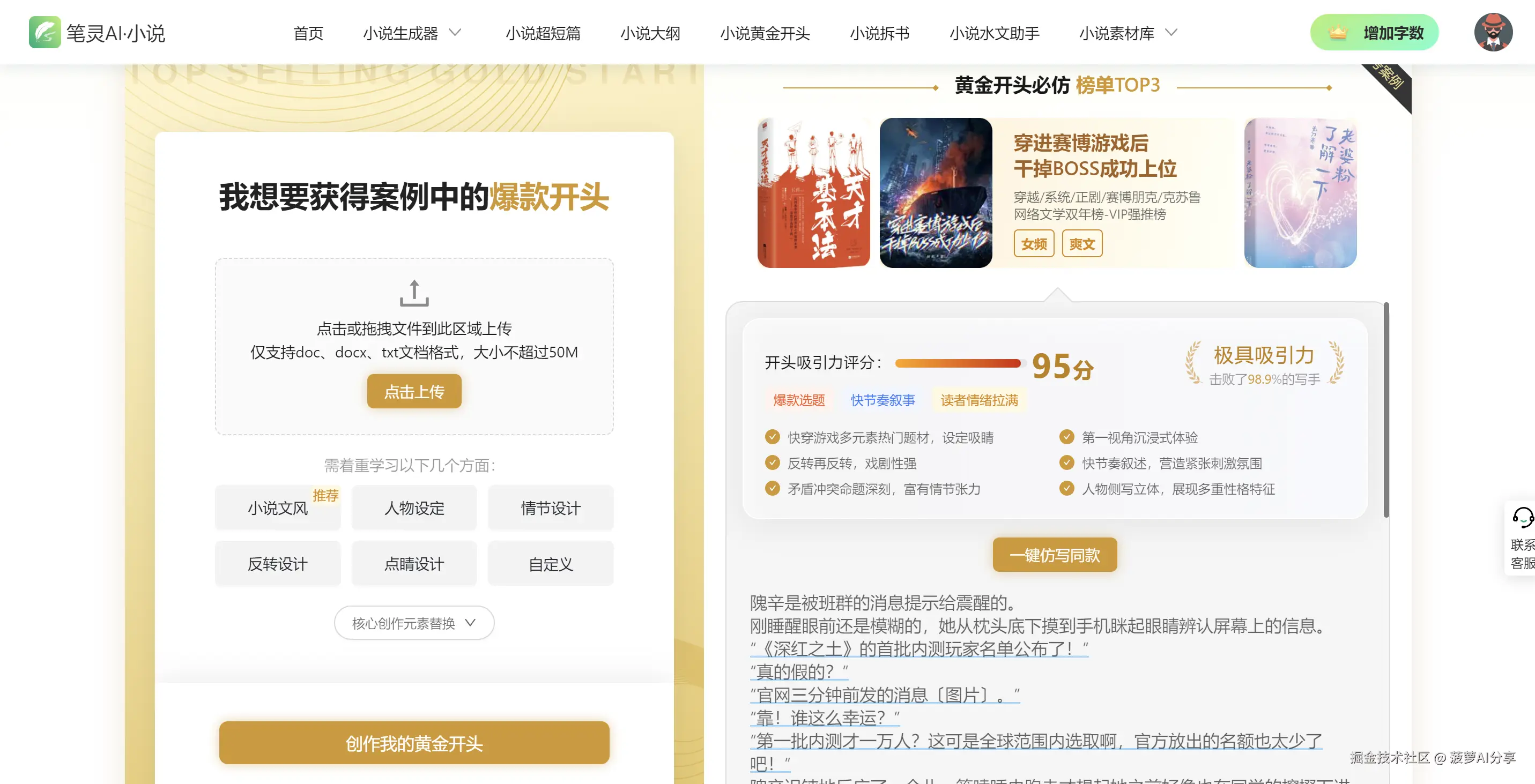 倘若它上面提供的爆款小说没有你喜欢的风格的话,还可以自己上传自己喜欢的爆款小说开头让其仿写,相当人性化~