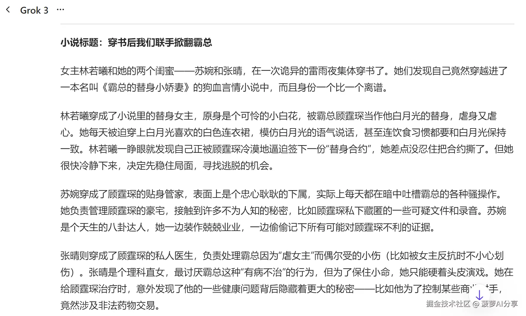 DeepSeek辞藻风格看似华丽,实则空洞无物,颇具网络言情古风那种浮夸、华而不实的味道,而且在写小说过程中还极易偏离主题。而 grok 的言辞则更为朴素简洁,并非那种平淡无味、毫无波澜的寡淡表述,其文笔风格更合我心意。