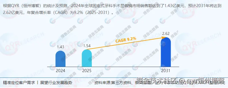 根据QYResearch数据,2024年全球固定式牙科手术显微镜市场规模达1.43亿美元,预计2031年将增长至2.62亿美元,2025-2031年复合增长率(CAGR)为9.2%。驱动因素包括全球老龄化加剧、口腔医疗需求升级及新兴市场渗透率提升。