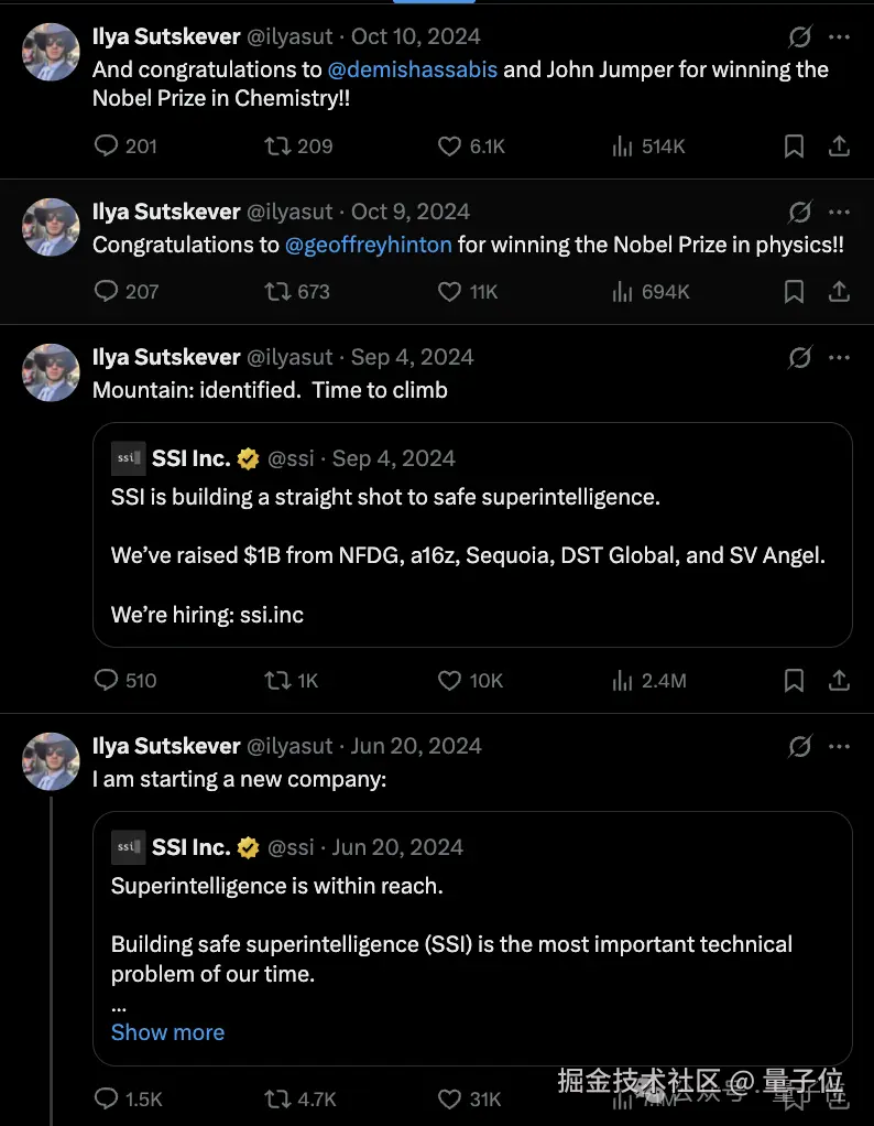 值得一提的是,这其实是从 OpenAI 离职之后的首次亮相。他的最新推文还停留在去年的诺奖祝福,更早之前就是他的创业官宣。