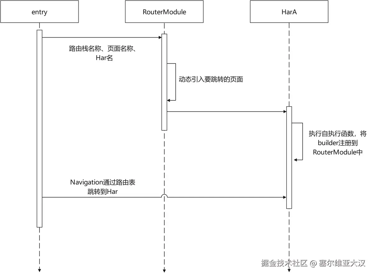上述方案,当在entry模块页面上点击跳转到harA模块的页面时序图如下: