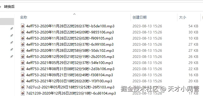 安卓手机端微信的语音文件,在转换好的文件里,前7个字符,表示它是一个会话的,比如一个私聊,或者一个群聊,只要是这个群聊里的,前7个字符都是一样的,只要听一下语音,就可以定位群聊了,然后根据后面的语音发送时间,就可以知道是什么时候的语音,要整理起来还是挺方便的。