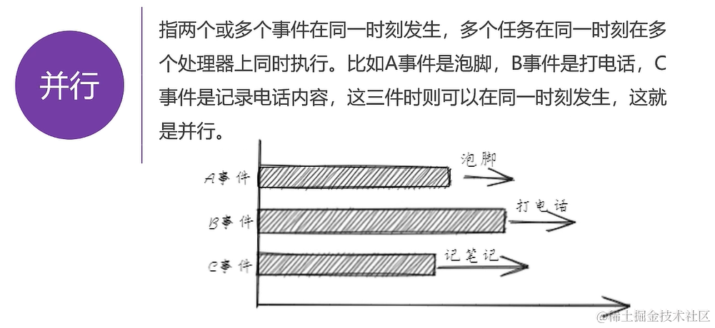 并行:是指两个或多个事件在同一时刻发生,多个任务在同一时刻在多个处理器上同时执行