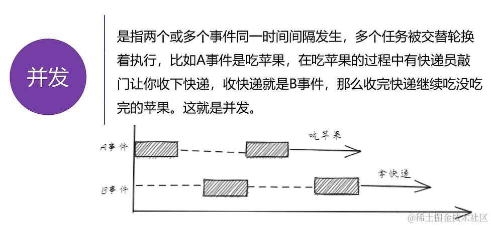 并发:是指两个或多个事件同一时间间隔发生,多个任务被交替轮换着执行