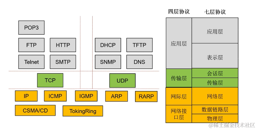 - TCP协议:TCP(Transmission Control Protocol)协议即传输控制协议,是建立在IP协议基础之上的。TCP协议负责两台计算机之间建立可靠连接,保证数据包按顺序发送到。它是一种可靠的、一对一的、面向有连接的通信协议。
