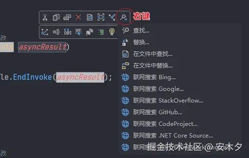 选中代码,或双击Shift 键时,它会自动显示。常用功能包括:重命名、查找、重构、选中相同的内容、添加注释、查找所有应用等,这里提供的功能都非常方便,可以深入研究下。