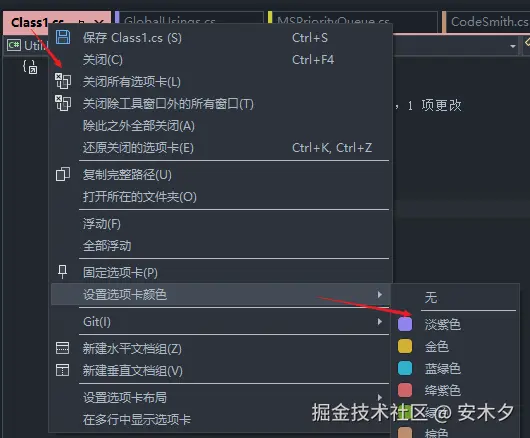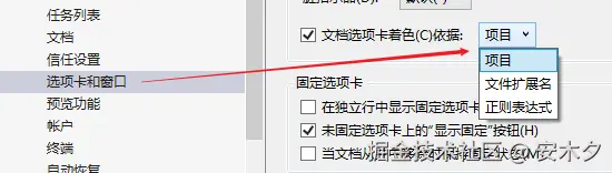 - 不同项目文件选项卡显示为不同的颜色,便于区分。需要在设置里启用【文档选项卡着色】。