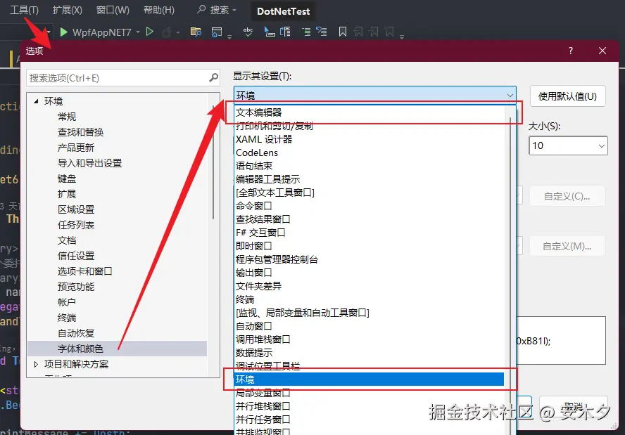 - “环境“为VS工具本身的字体,设置为“微软雅黑”,大小“10”。