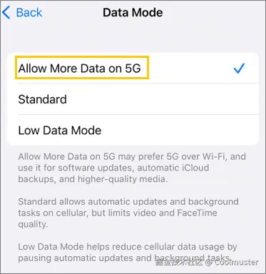 步骤 2. 选择蜂窝数据。点击 “数据模式” ,选择 “允许在 5G 上使用更多数据” ,导航回“蜂窝网络”屏幕,然后选择 “语音和数据” 选项。