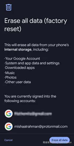 在Android上:转到 “设置”>“系统”>“重置选项”>“清除所有数据(恢复出厂设置) ”>“清除所有数据”,输入您的 PIN,然后开始重置过程。