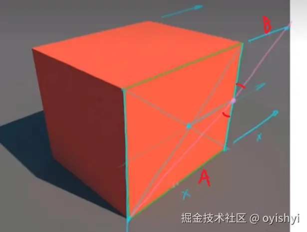 其实就是倍数线,二倍线三倍线之类的。一般用于像是路边有两个路灯,然后求第三个路灯的位置。先看下图的紫色线,让顶点和中心点连线,延长出来的点连成的线段 B 和正方形的边长 A 是一样的。你问为啥一样?因为夹角相等,且边相等。你画一个不带透视的正视图就懂了。如果你在看 B 站的视频,不要信弹幕的什么相似三角形,这是全等三角形在透视视角下的变形。哎,总之你画一个正视图就懂了。