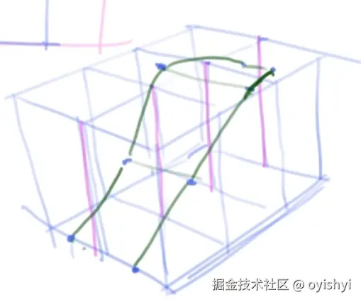 掌握了以上技巧后,就具备了空间中的任意一点的能力。当然了,很多时候可以靠估计。比如说下图中的曲面。在透视中会有很多神奇的现象,比如右边这个看起来接近直线,但在实际空间中是曲线。要是熟练了不仅能估算点,甚至外面的盒子很多时候都不用画了,全靠估。