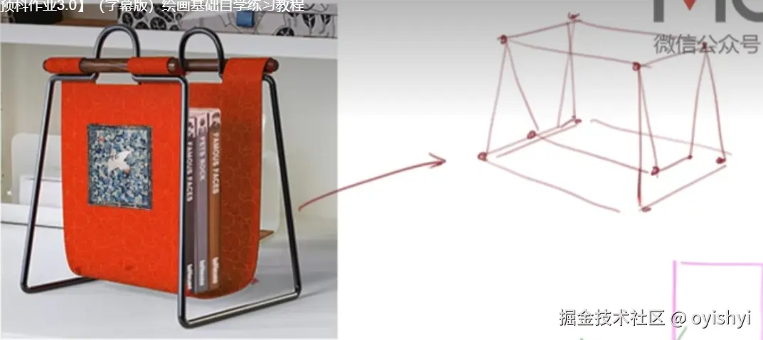 然后这周的作业,因为要画出来的,所以很多细节的小结构不用画了,但是基本结构要分出来。比如下图,概括的结构就行了。细节可以最后手动补全意思一下继续ing,比如说这个书架的耳朵可以后面画的时候估一下补出来即可,注意一下耳朵的近大远小即可,至于圆角也就只是弯一下就行。