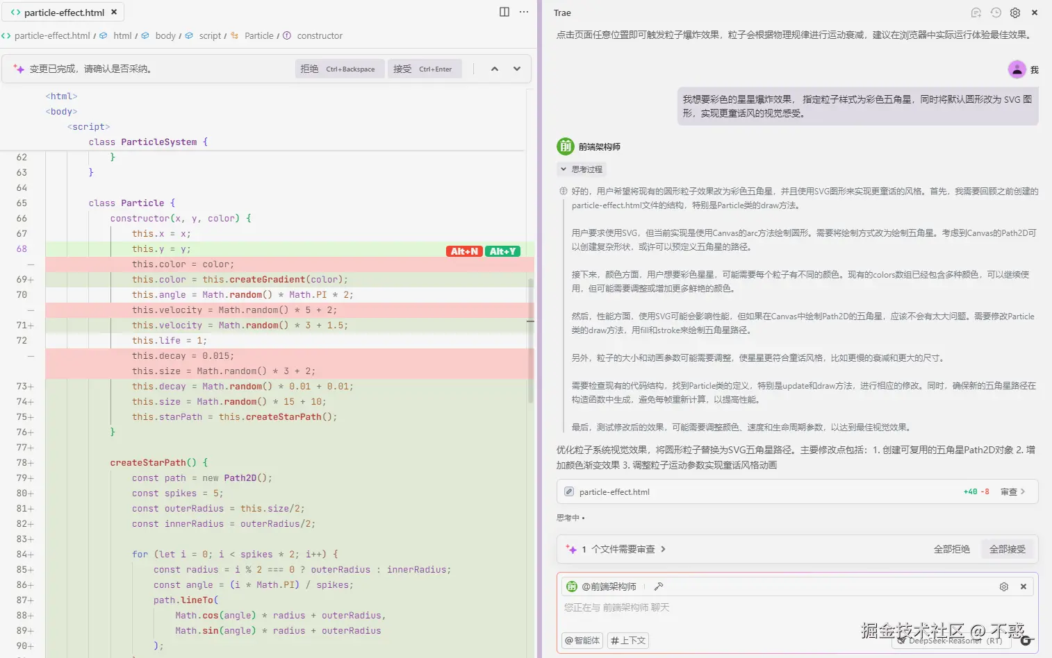 点击爆炸粒子特效,虽小但灵,是一种能瞬间提升用户感知的“视觉情绪工具”。有了 Trae 的帮助,你不必深入研究 canvas 或 animation,甚至无需动手编码,也可以快速为网页注入灵动而酷炫的视觉魔法。