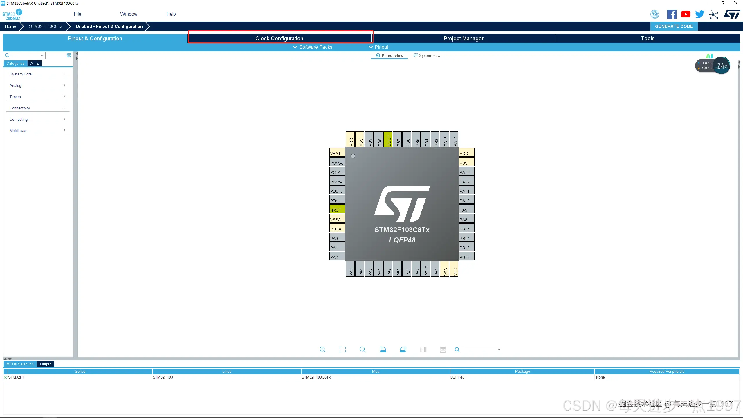 生成工程后的界面如下所示,点击“Clock Configuration”进入时钟配置界面,
