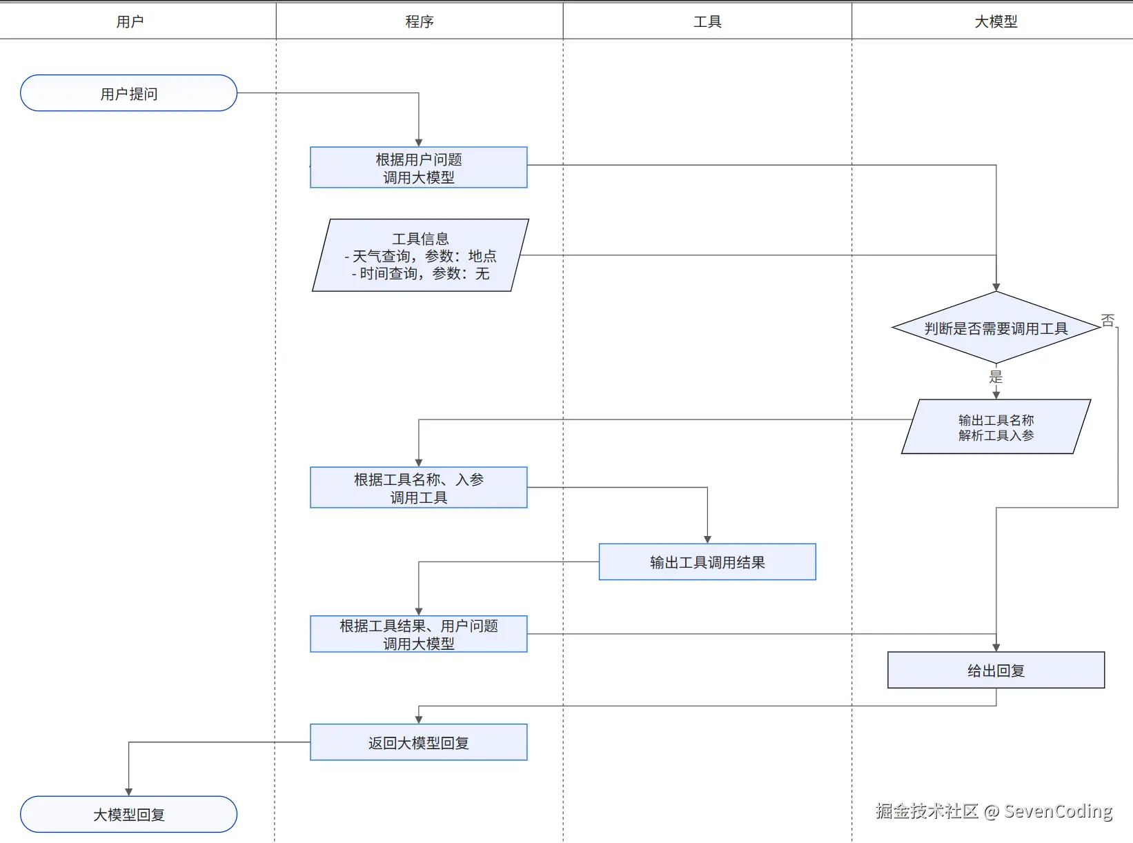 - Al Agen会把这些Tool的信息或者转化成System Prompt 或者转化成Function Calling的格式,然后和用户请求User Prompt一起打包发送给Al模型。