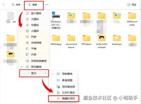 从电脑桌面的【此电脑】中找到目标内存卡,点击进入,在文件资源管理器上点击【查看】后,在列表上选择【显示】,最后看见【隐藏的项目】后点击。