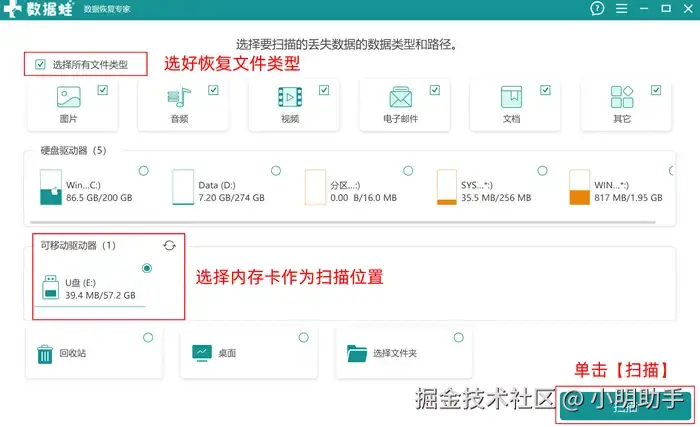 第1步: 先把内存卡的读卡器连接上电脑,在软件的主页上选择需要扫描的文件类型 (没有明确的类型可以直接勾选左上角的【全选】) ,选择内存卡的读卡器作为扫描对象,点击【扫描】;