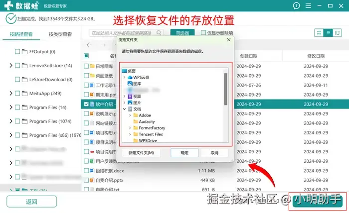 第3步: 在【浏览文件夹】的弹窗中选择恢复文件的存放位置,点击【确定】。