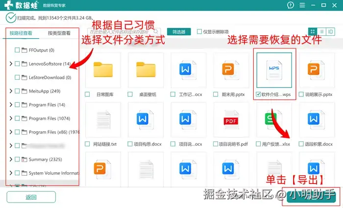 第2步: 在软件的指定位置上选择需要扫描恢复的文件,选中后点击【导出】;