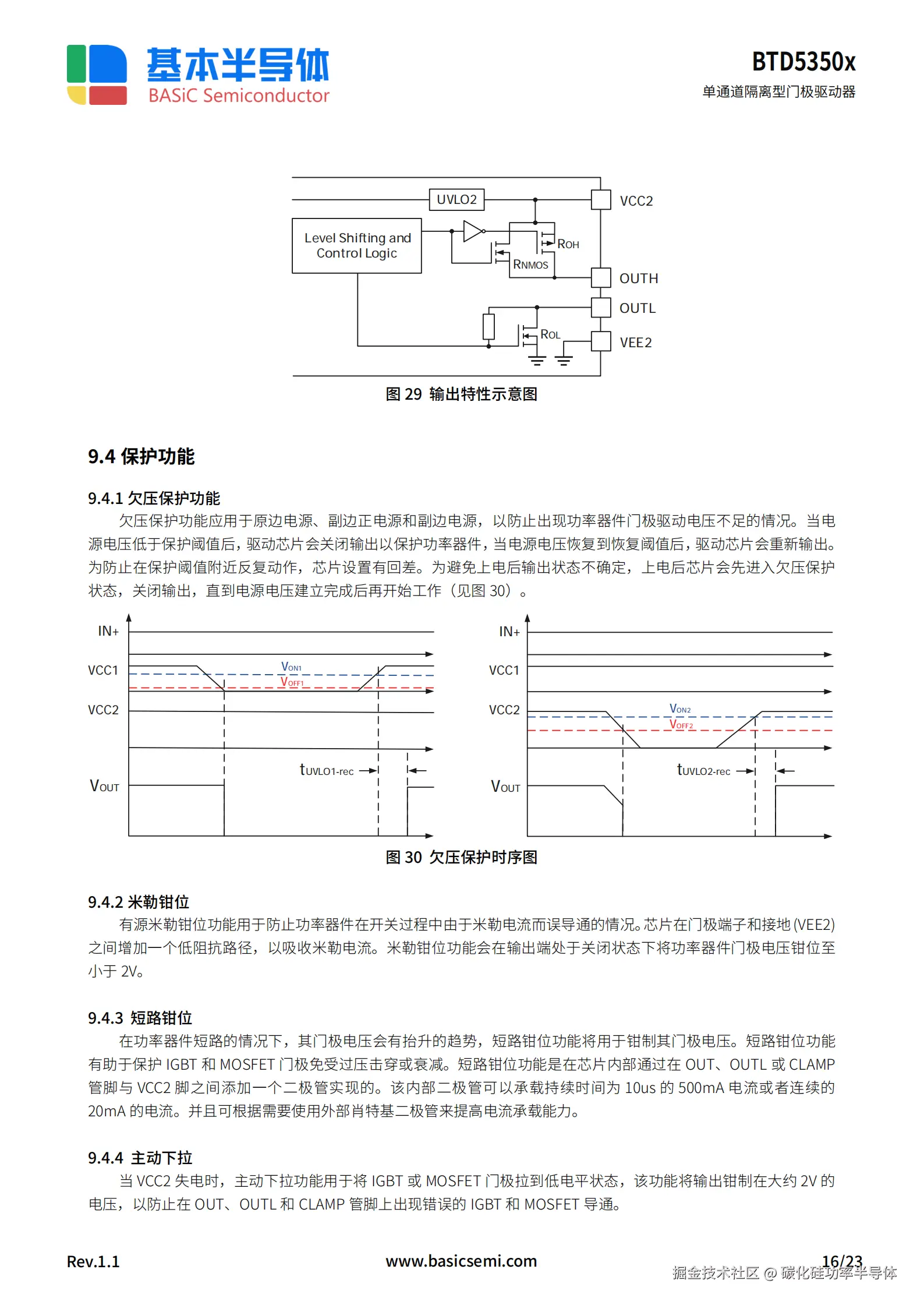 原副边独立欠压保护:原边电源欠压阈值 2.4-2.5V,副边正电源欠压阈值 10.3-11V(BTD5350E) ,避免门极电压不足导致的器件误动作。