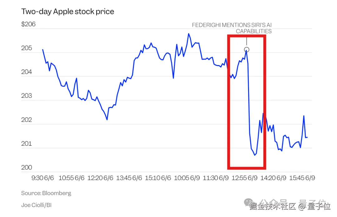 几乎就在这一时刻,苹果股价突然下跌逾 2.5%,从约 206 美元跌至 201 美元以下,相当于市值缩水 750 亿美元。