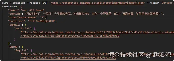 curl --request POST 'https://enterprise.qulang8.cn/api/shortVideo/makeVideoByToken' --header 'Content-Type: application/json' \