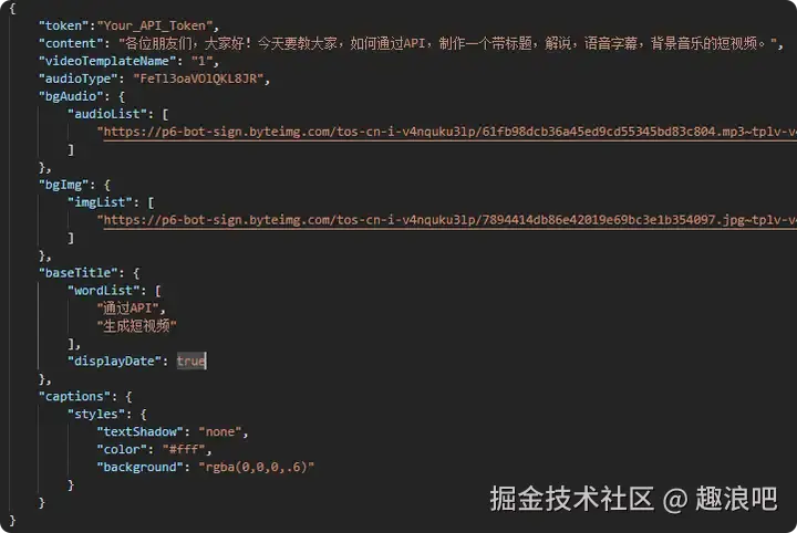 "content": "各位朋友们,大家好!今天要教大家,如何通过API,制作一个带标题,解说,语音字幕,背景音乐的短视频。",