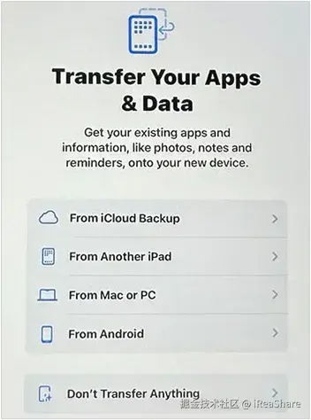 第 3 步: 现在,您可以将备份恢复到新 iPad 上。请打开您的新 iPad 并按照屏幕上的设置说明进行操作,直至到达“传输您的应用程序和数据”屏幕。