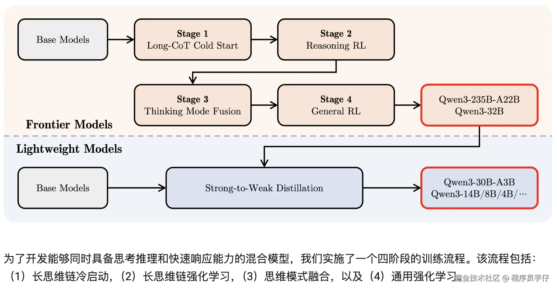 主要是后训练阶段做的工作,先是进行推理的学习,也就是图中的 stage1 和 stage2,长思维链,就是推理模式的训练核心。