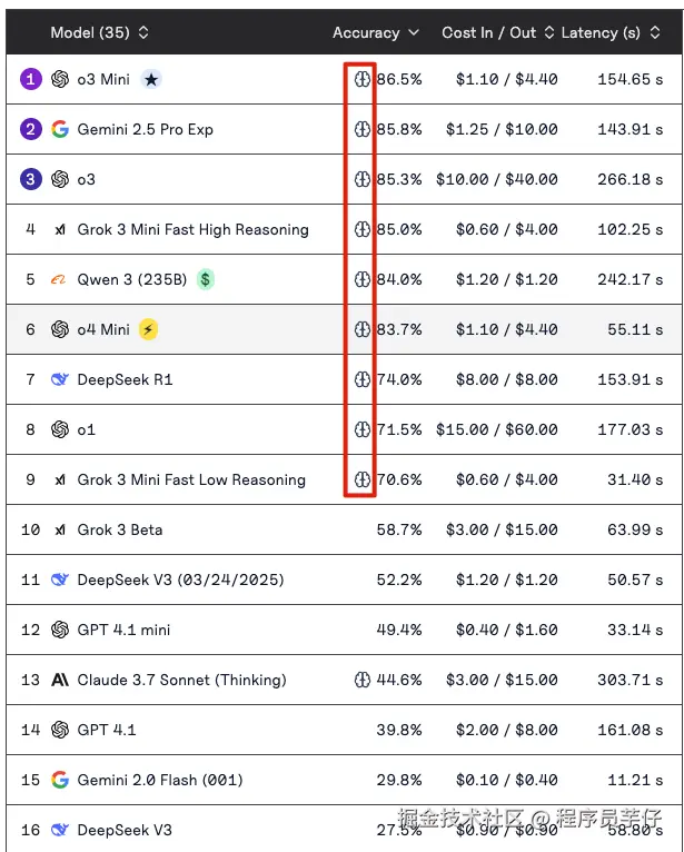 ps: 这里其实有几个比较有趣的数据,排名11 和 排名16的 deepseek-v3-0324 和 deepseek-v3,可以看出来经过调教的普通模型,在数学能力上也能大幅提升。而排名 13 的 claude-3.7-sonnet(thinking) 的数据,也说明了,未经调教的推理模型,也不见得在数学能力上能够大幅提升,但是比不思考效果确实要好。