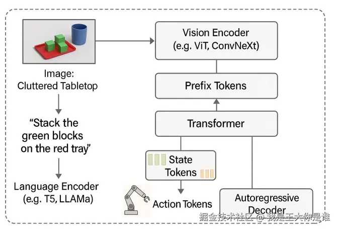 - Prefix Tokens :编码上下文和指令,前缀 token 是 VLA 模型的上下文主干。这些 token 将环境场景(通过图像或视频)及其附带的自然语言指令编码成紧凑的嵌入,从而为模型的内部表征做好准备。