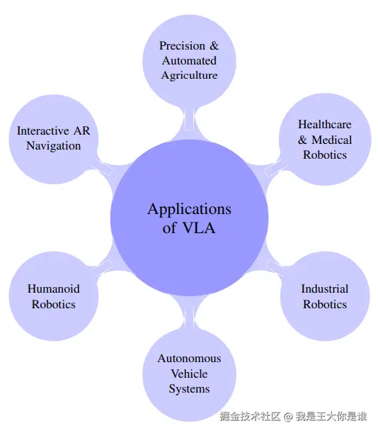 VLA 模型正迅速崛起,成为具身智能的基础构建模块,将感知、自然语言理解和运动控制集成到一个统一的架构中。通过将视觉和语言模态编码到共享的语义空间中,并生成上下文落地的动作,VLA 模型实现智体与其环境之间的无缝交互 。这种多模态能力使 VLA 成为现实世界中广泛应用的变革性智体。在人形机器人领域,Helix 和 RoboNurse-VLA 等系统将视觉、语言和灵巧操作相结合,以协助完成家务和外科手术,并展示了实时推理和安全感知控制。在自动驾驶汽车领域,OpenDriveVLA 和 ORION 等模型处理动态视觉流和自然语言指令,以便在复杂的城市环境中做出透明、自适应的驾驶决策。工业部署利用 VLA 架构实现高精度装配、检测和协同制造。在农业领域,基于 VLA 的机器人系统能够实现视觉引导的水果采摘、植物监测和异常检测,从而减少对劳动力的依赖并提高可持续性。此外,交互式增强现实系统的最新进展利用 VLA 模型进行实时、基于语言的空间导航,根据语音或视觉提示在室内和室外环境中引导用户。在这些领域,VLA 提供了一个统一的框架,用于执行稳健、适应性强且语义一致的任务,标志着向具身化通用智能体的关键转变。各个领域的更详细的介绍可以看论文内容。