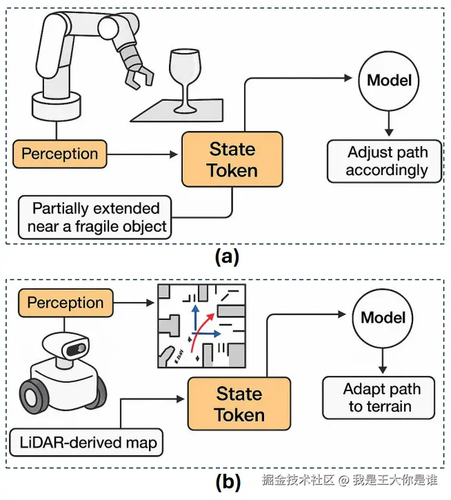 - State Tokens:嵌入机器人的配置,除了感知外部刺激之外,VLA 还必须感知其内部的物理状态。这通过使用状态 token 来实现,状态 token 编码关于智能体配置的实时信息——关节位置、力-扭矩读数、夹持器状态、末端执行器姿态,甚至附近目标的位置。这些 token 对于确保态势觉察和安全至关重要,尤其是在操作或运动过程中。