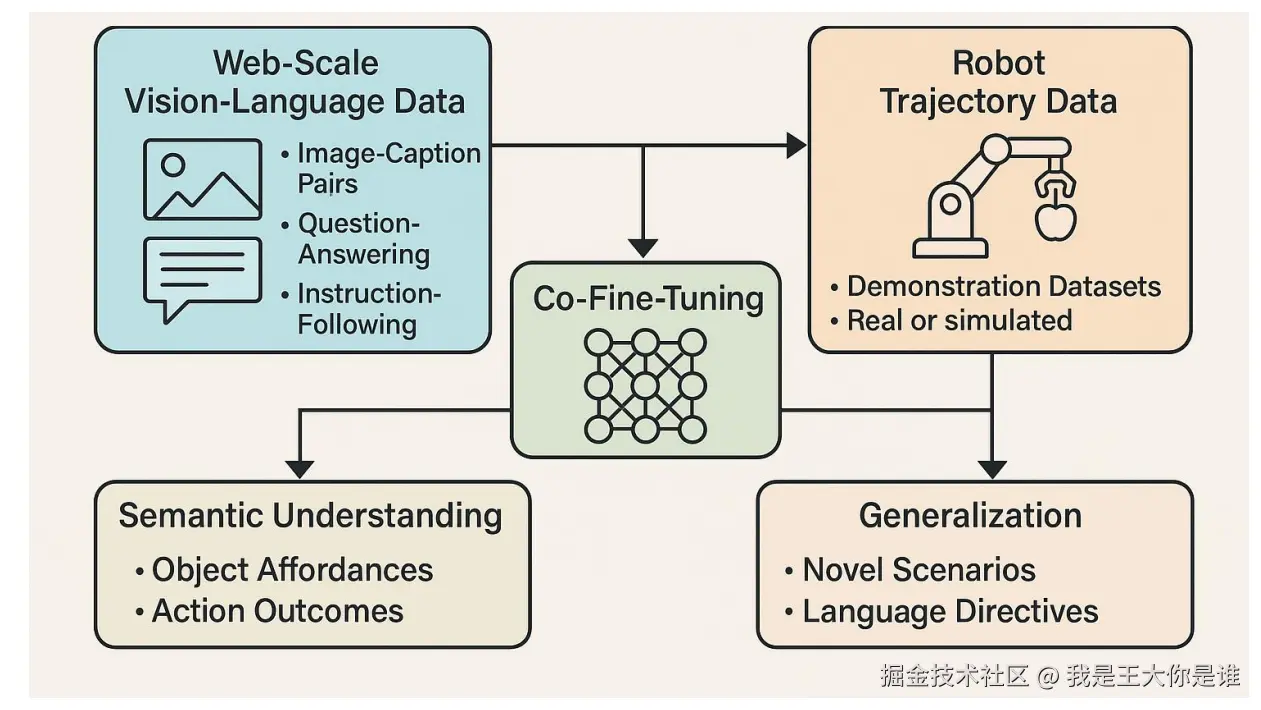 - 训练 VLA 模型需要一种混合学习范式,该范式整合来自网络的语义知识和来自机器人数据集的任务落地信息