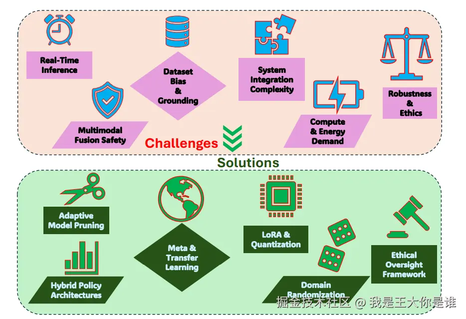 - 综述还进一步讨论了实时控制、多模态动作表示、系统可扩展性、对未见过的任务的泛化以及道德部署风险等主要挑战。