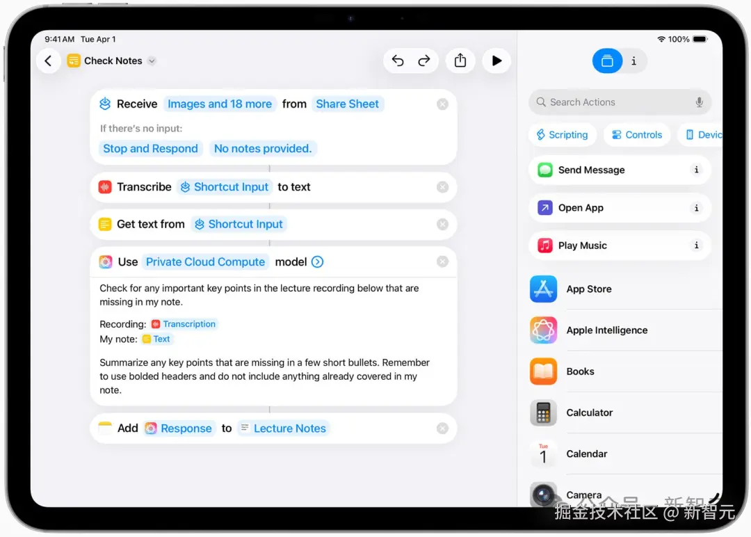 比如,一个学生可以创建一个快捷指令,用 Apple Intelligence 模型把课堂讲座的音频转录和自己的笔记对比,补上漏掉的重点内容。