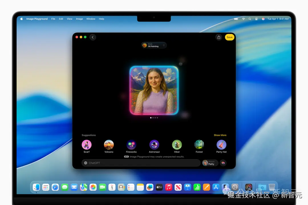脑子里有啥具体想法?点「任意风格」描述一下想要的,Image Playground 就会把你的描述或照片传给 ChatGPT,生成一张独一无二的图片。