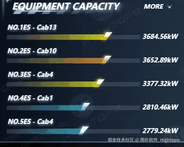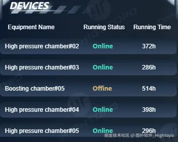 利用图扑 HT 丰富的图表组件,为不同设备匹配专属色彩进度条,直观展示设备容量大小。运维人员可依据进度条长短,快速对比各设备容量,评估设备状态,降低数据理解成本。还可以将实时获取到高压室、增压室等设备的名称、运行状态及运行时间等信息同步展示,让运维人员精准掌握设备工况,及时处理离线设备的异常情况,合理安排在线设备的维护与调度工作。