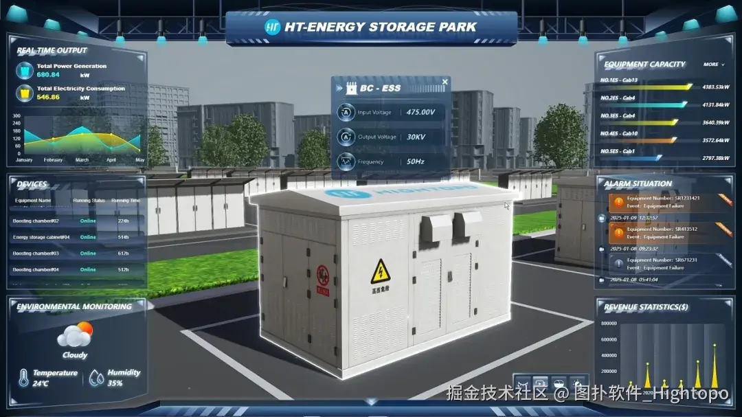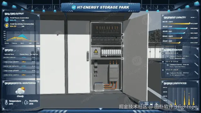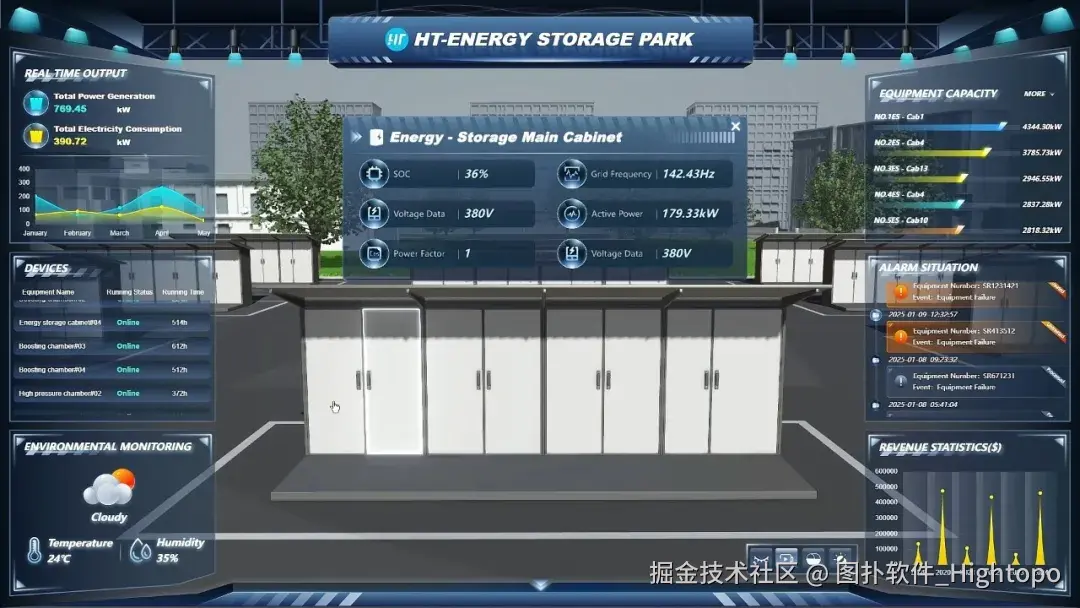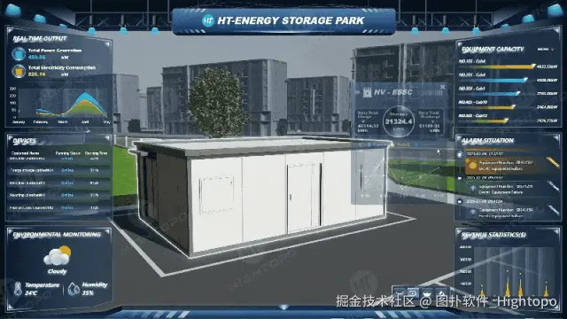 图扑软件自研的 HT for Web 产品包含 2D 编辑器与 UI 库,拥有丰富的图表、图形以及设计元素,能够将储能园区系统的各项管理数据,从相对复杂、抽象的状态转化为可视化形式,以更直观、更易于理解的方式呈现出来。